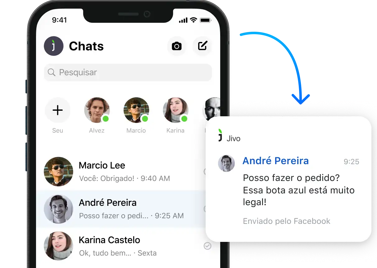 Receba as mensagens enviadas pelos clientes na rede social diretamente no aplicativo JivoChat. Dessa forma, você não precisa ficar com diversos apps e abas abertas no navegador e receberá notificações de novas mensagens em um único local.