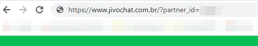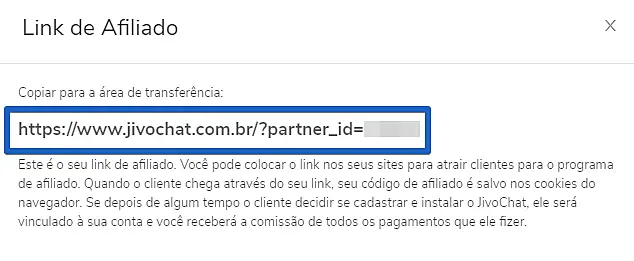 Este é o seu link de afiliado (O que está escondido no quadrado azul, é o seu ID de afiliado). Você pode colocar o link nos seus sites para atrair clientes para a sua conta de afiliado. Quando o cliente chega através do seu link, seu código de afiliado é salvo nos cookies do navegador. Se depois de algum tempo o cliente decidir se cadastrar e instalar o JivoChat, ele será vinculado à sua conta e você receberá a comissão de todos os pagamentos que ele fizer.