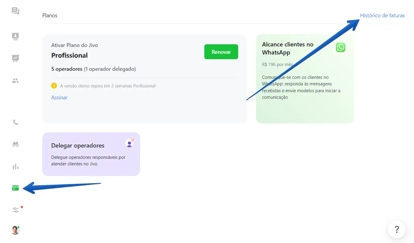 Agora, caso ainda não tenha gerado o boleto para o parceiro, peça para ele acessar o aplicativo da Jivo e acessar a aba "Faturamento", em seguida selecione "Histórico de faturas", escolha a última fatura gerada e em seguida o seu parceiro poderá escolher as formas de pagamento da assinatura.