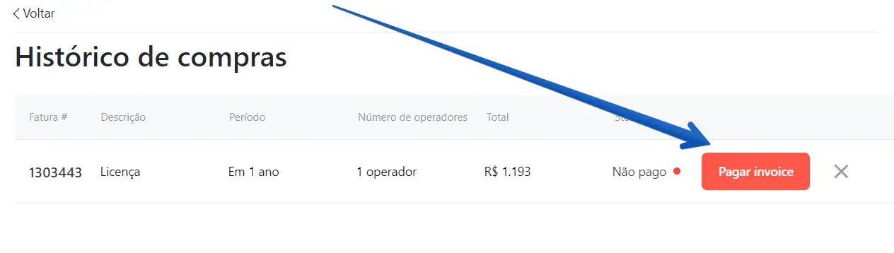Clique em "Abrir fatura" para abrir o boleto gerado e realizar o pagamento da sua assinatura do JivoChat. Pode levar até 24 horas para a ativação da assinatura em pagamentos via boleto. Note que os boletos gerados possuem 1 dia de validade. Caso perca o prazo de pagamento, deverá gerar um novo boleto.