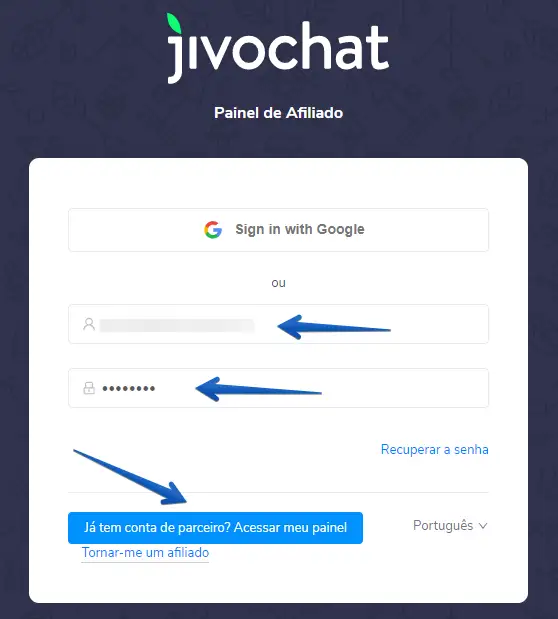 Primeiramente, acesse o seu Painel de Afiliado clicando neste link aqui, insira o seu login e senha de acesso e depois clique no botão azul conforme imagem abaixo: