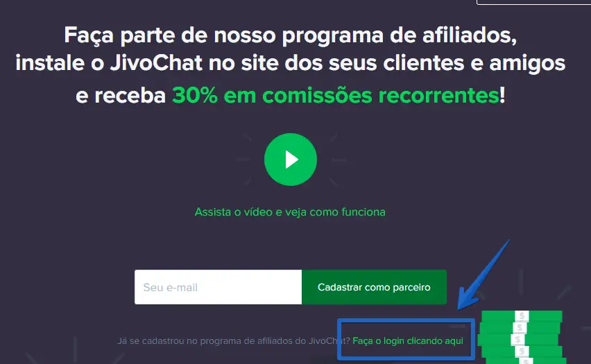 Ao acessar a página indicada acima, você verá o botão "Cadastrar como parceiro". Então, abaixo terá a seguinte frase, "Já se cadastrou no programa de afiliado JivoChat? Faça o login clicando aqui", então clique em "Faça o login clicando aqui".