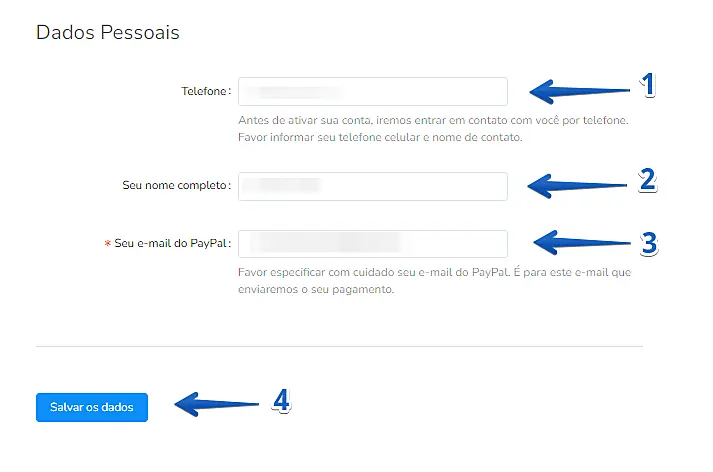- Seu Email do PayPal (Por favor, especifique com cuidado seu e-mail do PayPal. É para este e-mail que enviaremos o seu pagamento.)