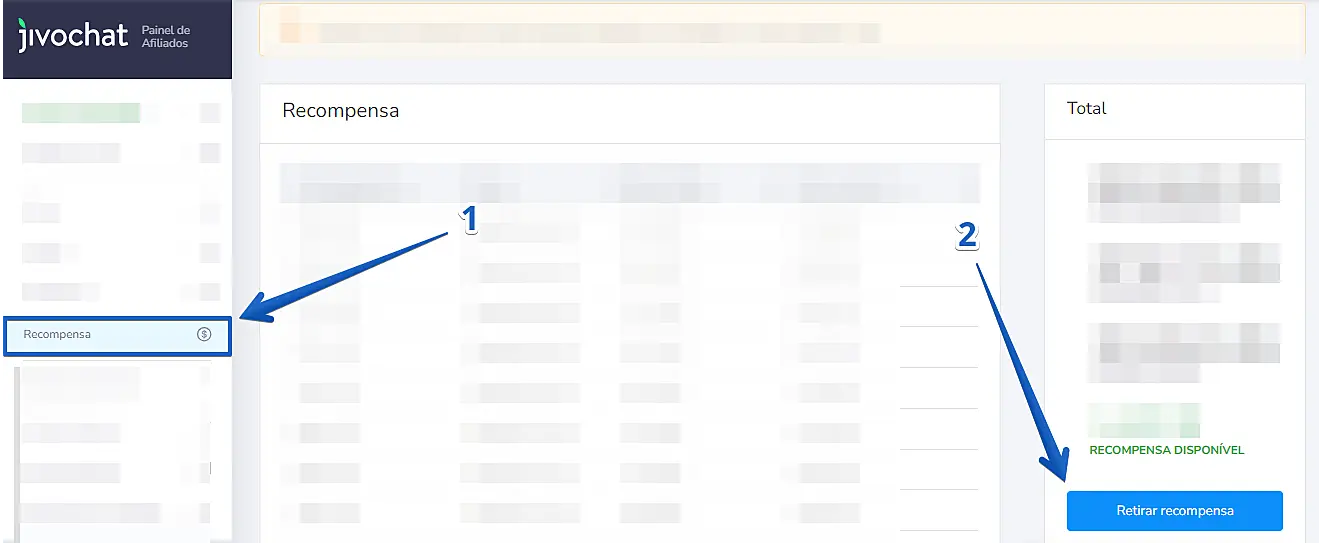 Em seguida, no menu lateral, clique em "Recompensa" e posteriormente em "Retirar recompensa"