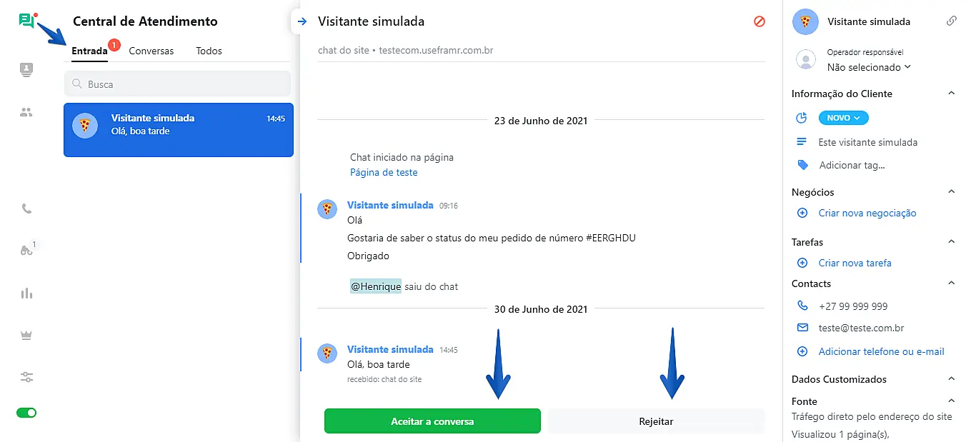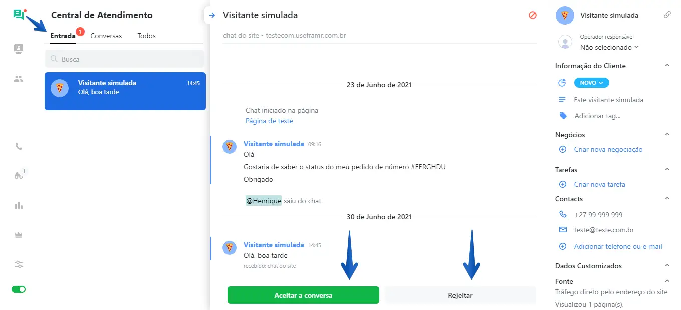 A Entrada contém todas as novas conversas que ainda não foram aceitas por nenhum operador. Nessa aba, você pode aceitar ou ignorar conversas. Ao ignorar uma conversa, você esconderá a notificação dela por um curto período de tempo. Entretanto, a conversa retornará à aba Entrada após um certo tempo e continuará reaparecendo até que seja aceita por um dos operadores disponíveis.
