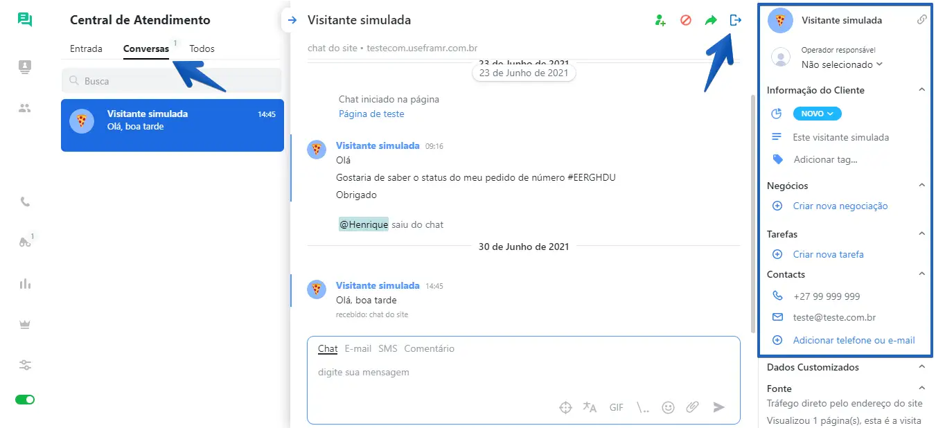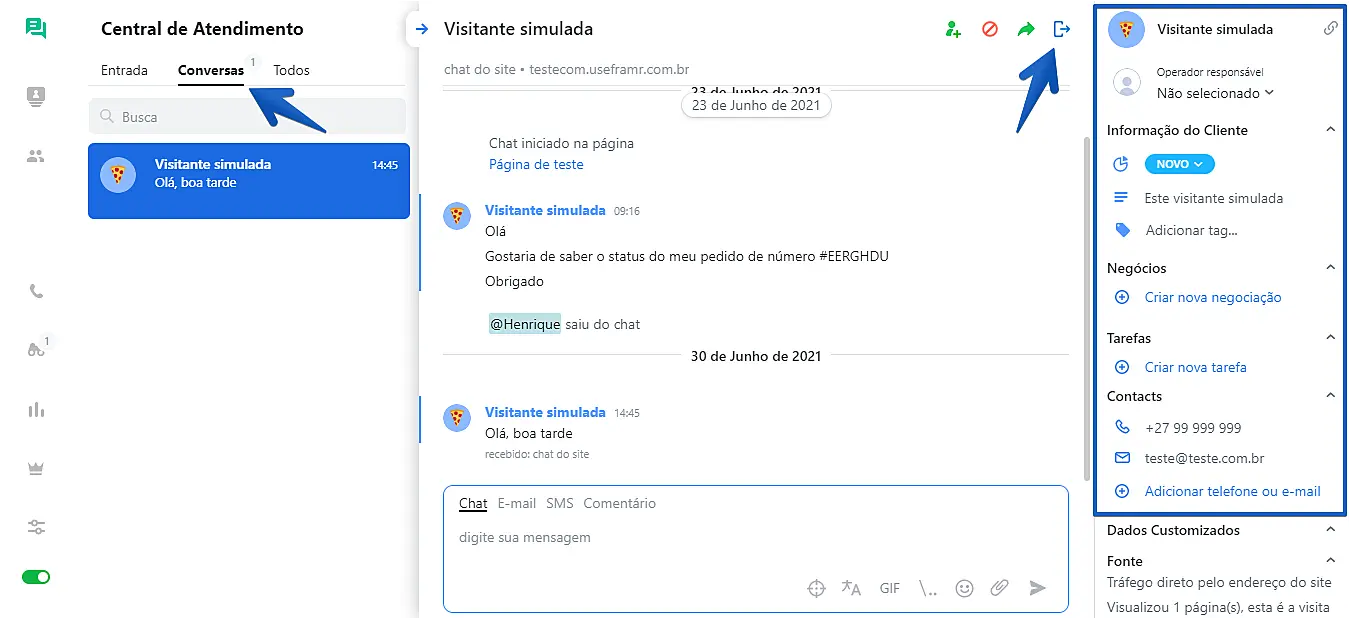 A aba Conversas contém todas as suas conversas abertas com clientes. Nessa aba ocorre a comunicação com clientes. Além do histórico de conversa e do campo de entrada de texto, há o painel informativo com dados sobre o cliente e botões de controle do chat, como criar nova tarefa, criar nova negociação, adicionar uma tag, dentre outros. Na parte superior direita do chat temos algumas opções como, transferir conversa ou convidar um colega para se juntar à conversa, bloquear cliente ou encerrar o chat, que fará com que a conversa seja direcionada para a aba "Todos".