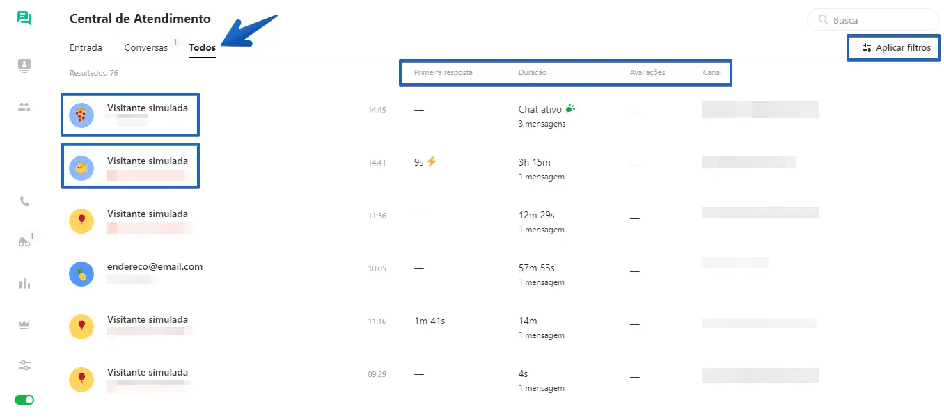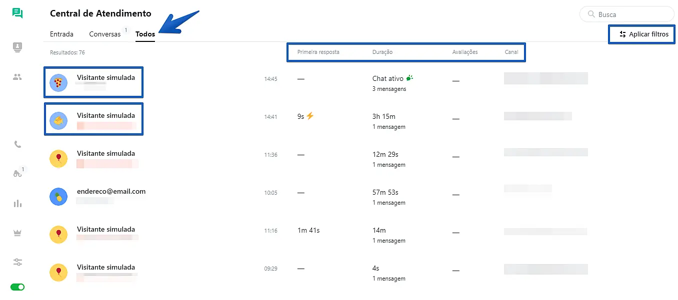 A aba Todos permite que você visualize todas as conversas encerradas e alguns dados estatísticos sobre cada uma delas. Você pode utilizar filtros ou a opção de busca para encontrar conversas específicas. Adicionamos também um recurso muito útil - a possibilidade de juntar-se a uma conversa com um cliente sem precisar sair da aba "Todos". Basta clicar no botão Juntar-se ao chat e enviar mensagens aos clientes a qualquer momento de forma prática e rápida, podendo depois facilmente voltar a conferir o resultado da busca.