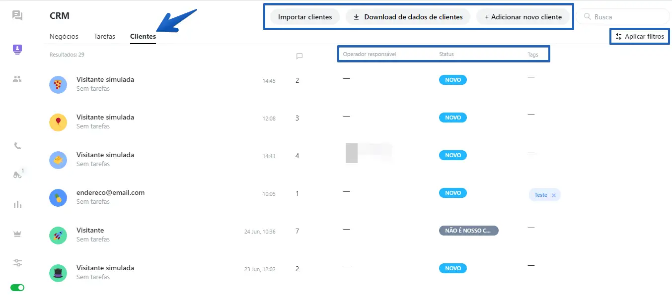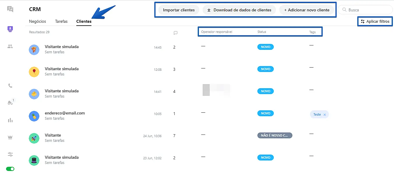 Você pode usar a parte de Filtros do lado direito da tela para filtrar e achar um cliente mais rapidamente. Nesta sessão você também terá acesso a informações como, operador responsável, o status dos clientes e as tags adicionadas a cada um deles.