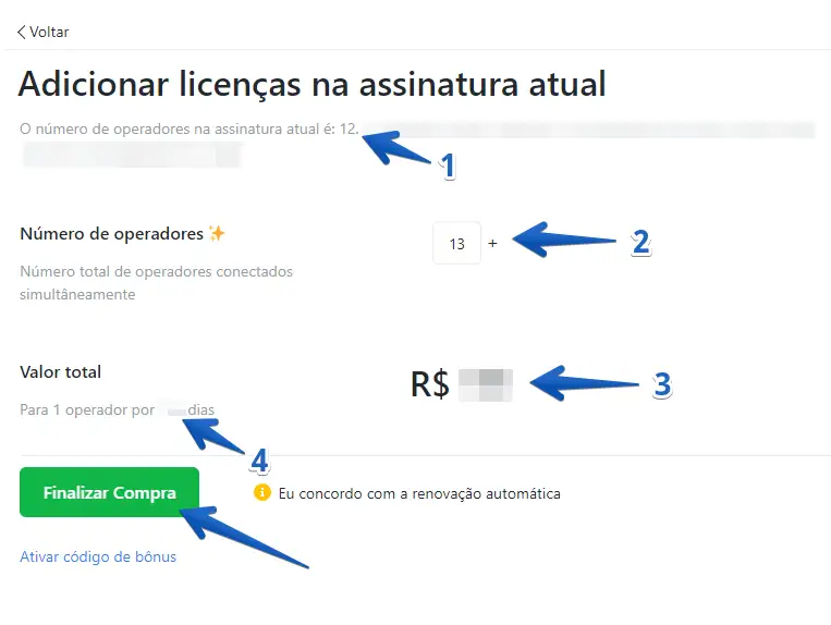 - 3. Valor total da compra. Favor notar que o pagamento inicial será relativo ao tempo restante da sua assinatura atual. A cobrança do valor cheio do total de licenças existentes na conta será realizada na próxima renovação.