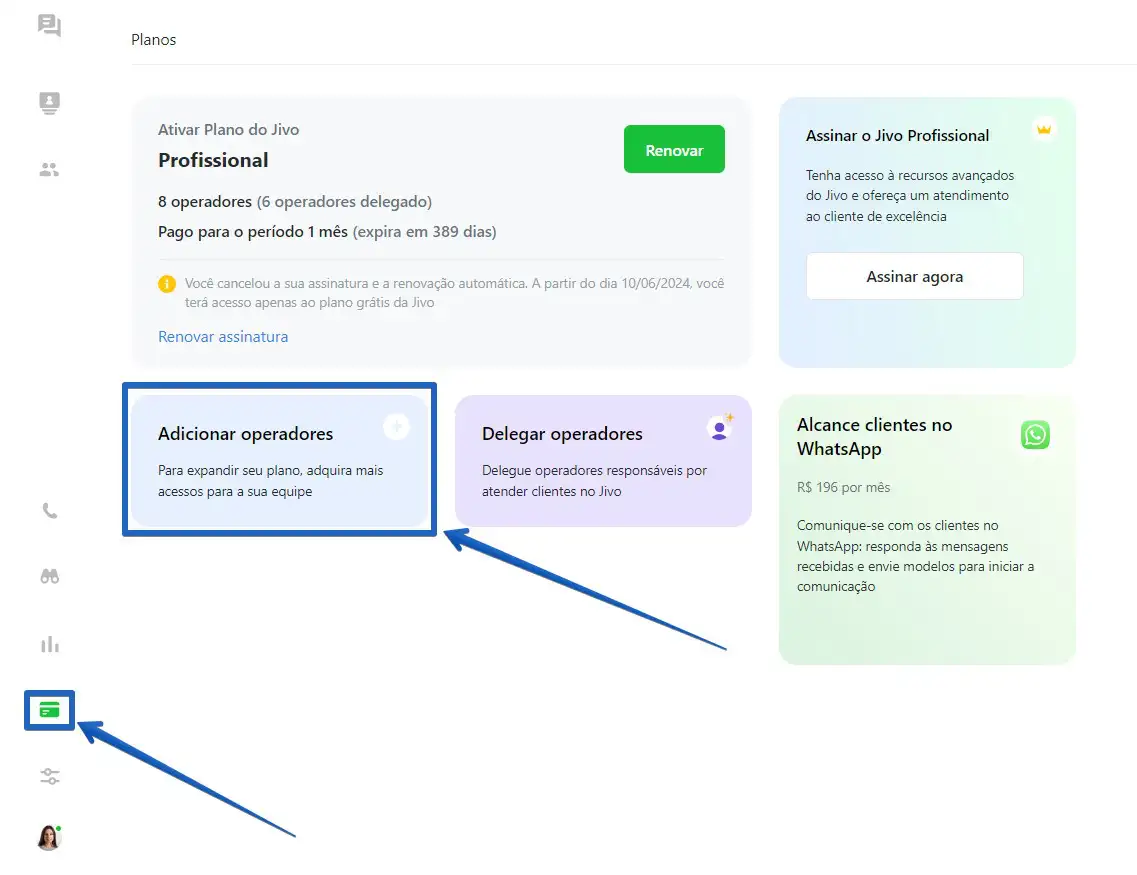 Caso queira adicionar mais licenças na sua assinatura profissional do JivoChat, basta seguir os passos abaixo: