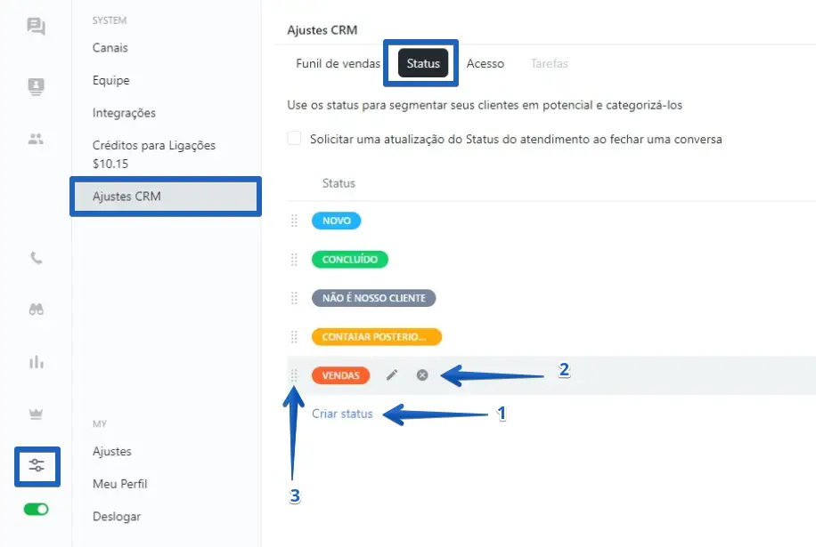 Para configurar o recurso de Status, acesse o oplicativo da JivoChat e clique em Configurações -> Ajustes CRM -> Status