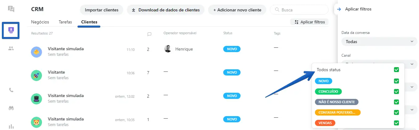 Essa opção está disponível na sessão CRM, na aba Clientes. Clique no filtro "Todos os status" e selecione um status específico. Você também poderá fazer o download dos dados dos clientes incluindo informações sobre o status.