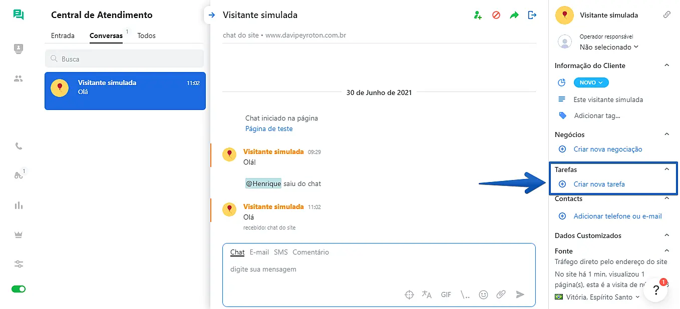 Você pode criar uma tarefa para qualquer conversa na sessão de "Central de atendimento". Para criar uma tarefa, clique em "Criar nova tarefa" do lado direito da janela de conversa.