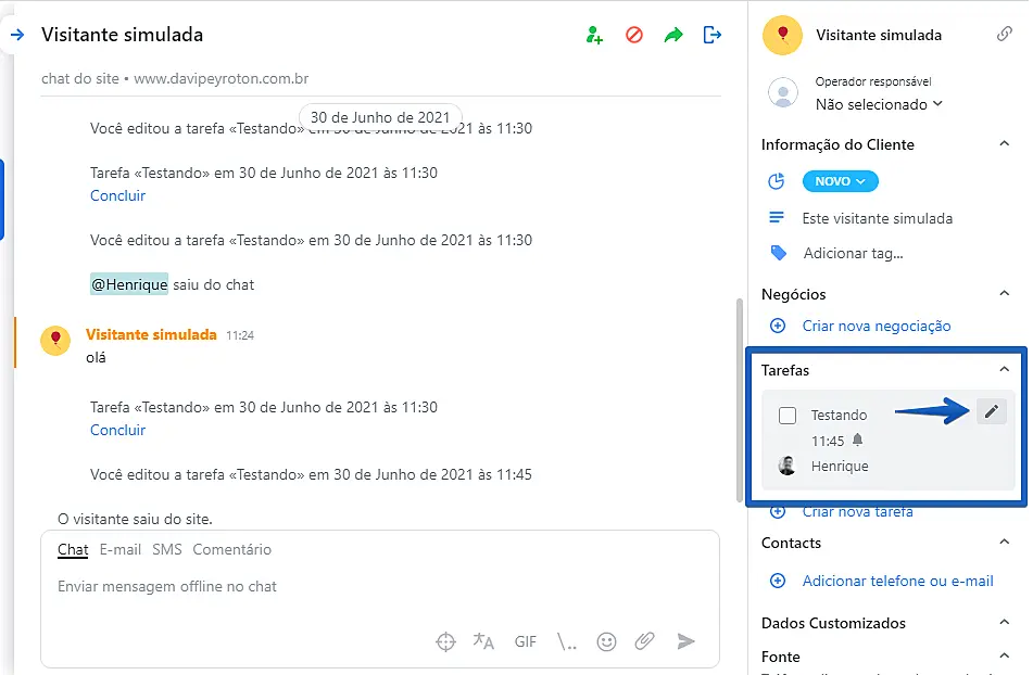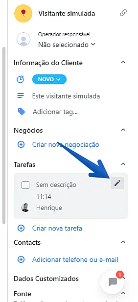 Para editar ou excluir uma tarefa, clique no ícone do Lápis no botão "Tarefa" no canto direito da janela de conversa. Se deseja editá-la, faça as alterações desejadas e clique no botão "Salvar". Já para excluí-la, clique em "Deletar tarefa".