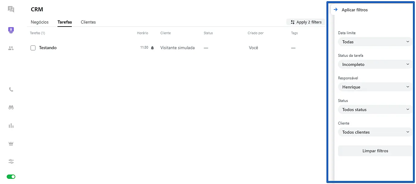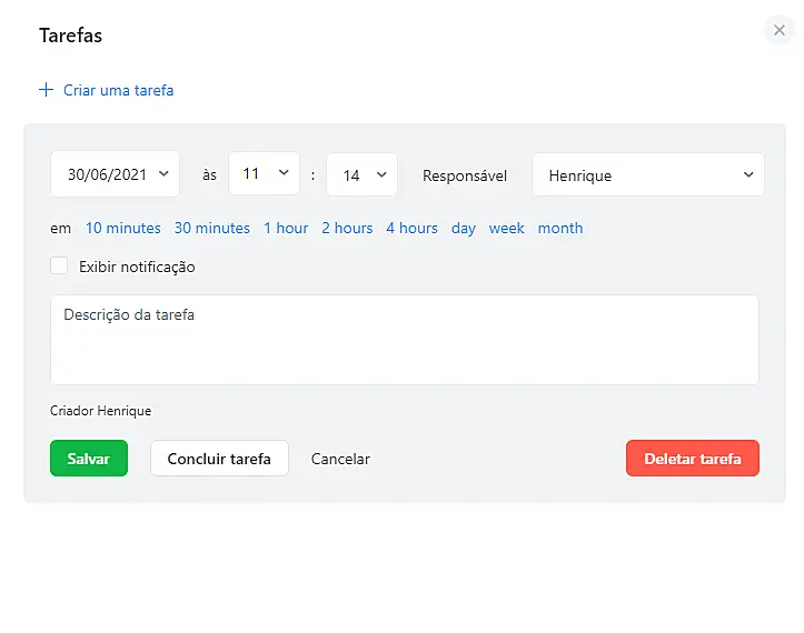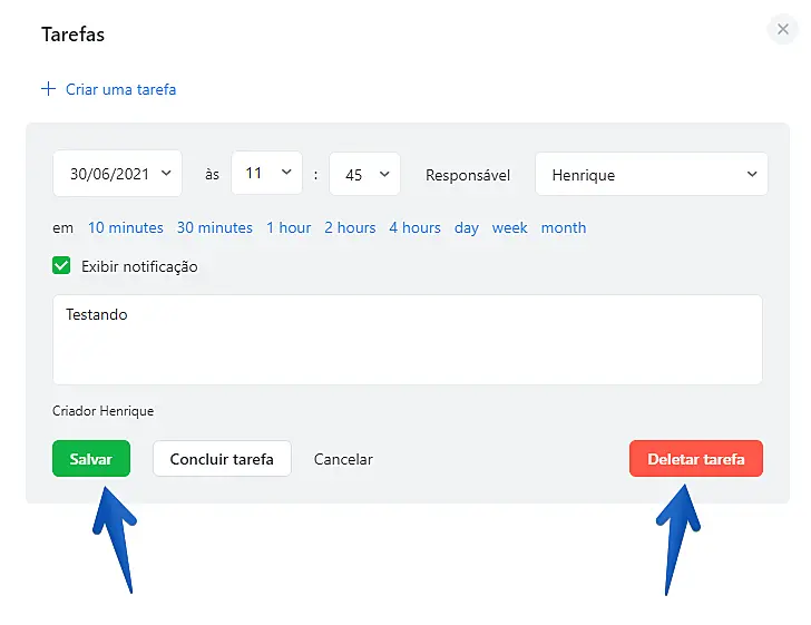 Observe que completar uma tarefa não a remove da sessão "CRM". Para remover completamente uma tarefa da sessão "CRM"> "Tarefas", você precisa excluir a tarefa.
