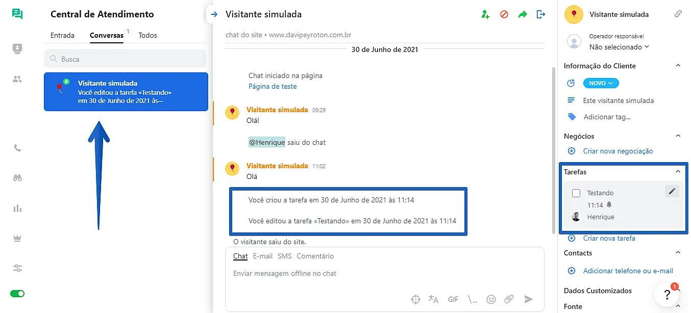 No horário e a data selecionados, a conversa com a tarefa será aberta automaticamente na sessão "Central de Atendimento > Conversas, no aplicativo do operador.