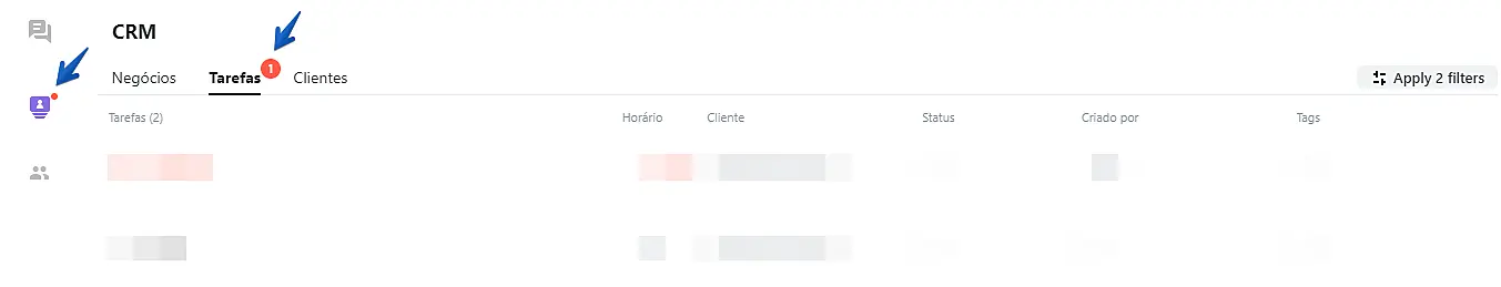 Quando uma tarefa for concluída, sua cor ficará cinza claro na sessão "CRM"> "Tarefas" e o ícone de sino será removido do ícone do cliente.