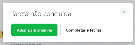 Caso o operador tente sair de um chat com uma tarefa incompleta, ele será solicitado a "Adiar para amanhã" ou "Completar e fechar".