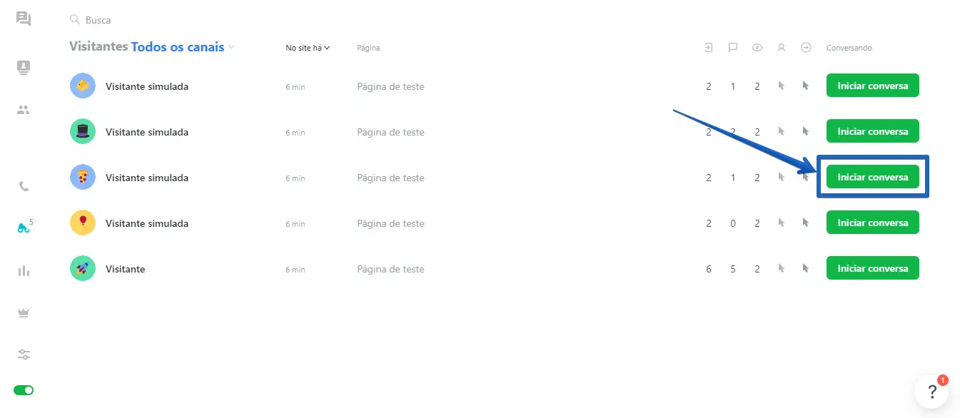 Se quiser convidar um visitante para uma conversa, ou enviar para ele mais mensagens após um convite pró-ativo já ter sido enviado através de um operador, você deve clicar no botão "Iniciar conversa" ao lado do visitante desejado, no canto direito da janela do aplicativo.