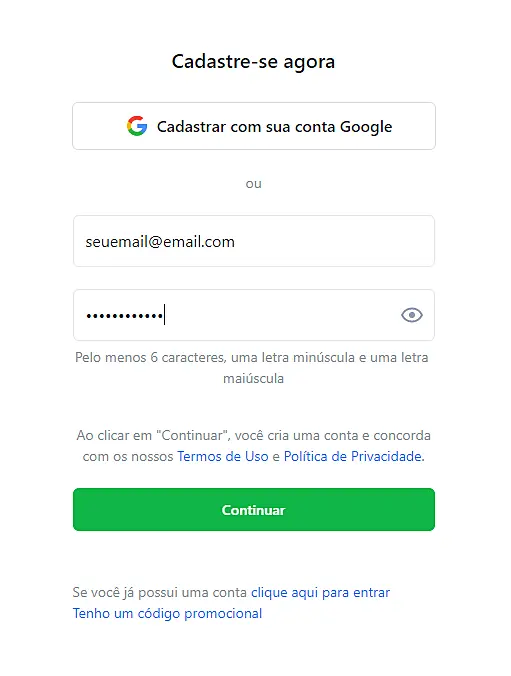 Insira o e-mail desejado para o administrador da conta e crie uma senha ou crie uma conta diretamente pelo seu login do Gmail. Esta conta de administrador lhe dará acesso ao aplicativo com o modo admin incluído, com acesso a todas as configurações e estatísticas da conta.