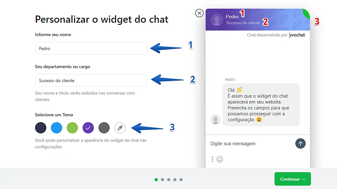 Insira o nome do operador (1) respectivo ao e-mail de cadastro, o seu cargo (2) e a cor do tema (3) para o chat que será instalado em seu site (estas informações podem ser alteradas dentro do aplicativo a qualquer momento). Assim que inserir todas as informações, clique em Continuar.