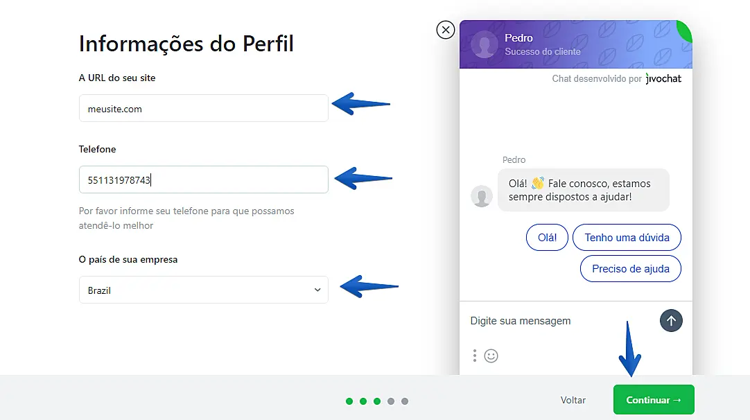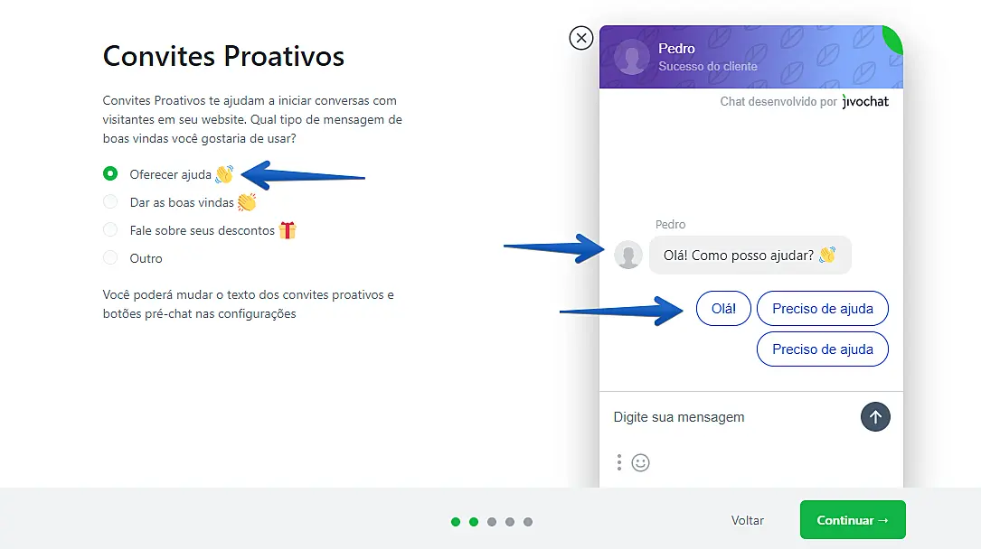 Nesta etapa, você vai poder escrever o melhor convite proativo para o chat em seu site. Este convite proativo vai te ajudar a aumentar a conversão de visitas em conversas (você pode alterar o texto e os botões a qualquer momento dentro do aplicativo). Logo após escolher, clique em Continuar.