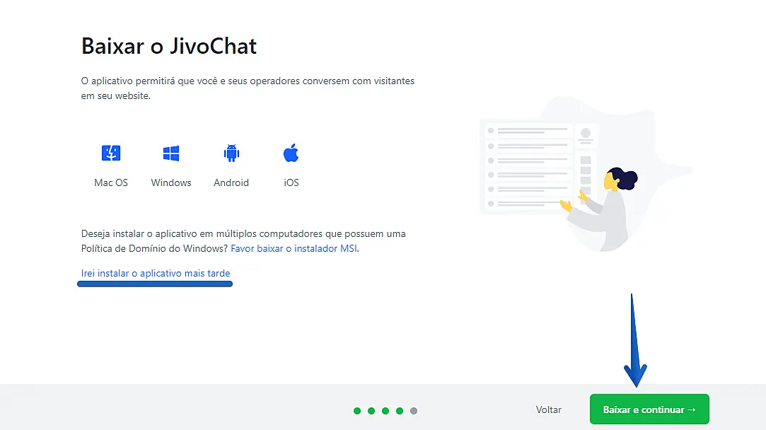 O mais recomendado é fazer o download do aplicativo para computador, pois é muito mais amigável para o dia-a-dia do atendimento e gestão. Também é possível obter a versão do JivoChat para iOS e Android.