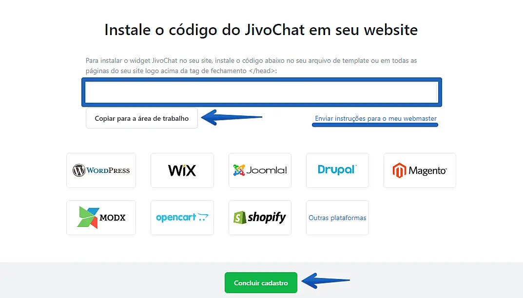 Chegamos na última etapa do cadastro, é o momento de copiar o código de instalação e colar em seu criador de sites, enviar para o seu desenvolvedor ou melhor ainda, instalar o nosso plugin disponível nas maiores plataformas de CMS do Brasil e do mundo.