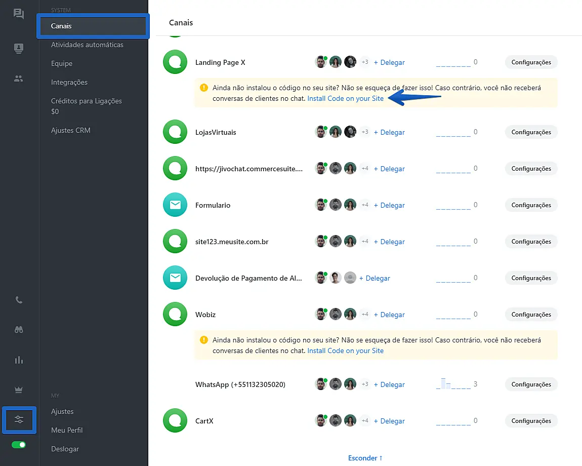 Se você precisar encontrar o código de instalação após já ter finalizado o processo de cadastro em nosso site, é só acessar o aplicativo da JivoChat que poderá visualizá-lo também a qualquer momento na seção em Configurações > Canais > Install Code on your site.
