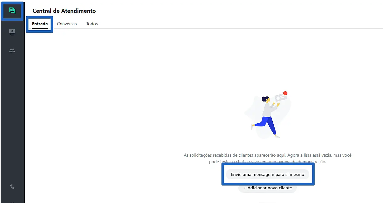Mas, antes você pode testar como ficou o seu chat em Central de Atendimento > Entrada > Envie uma mensagem para si mesmo.