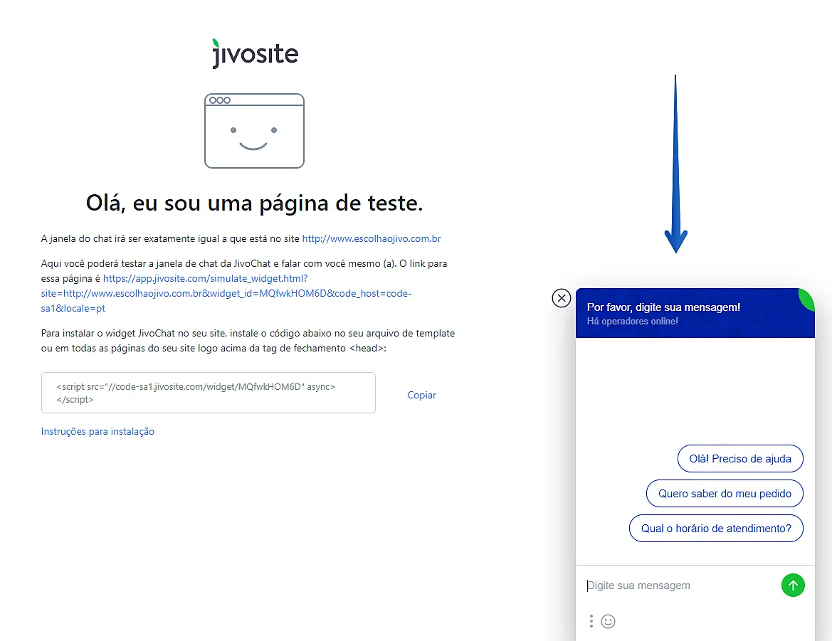 Ao seguir este caminho, você verá uma página de teste, e então começar a interagir consigo mesmo para testar todas as funcionalidades, recursos e ferramentas que o JivoChat oferece, além de navegar pelo aplicativo e ver as estatísticas em tempo-real e acompanhar os visitantes online pela aba "Visitantes".