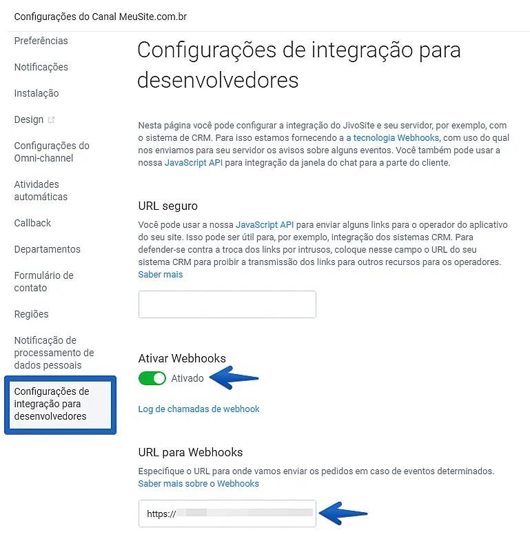 Depois, acesse o menu "Configurações de integração para desenvolvedores", ative os Webhooks e insira o Endpoint URL no campo "URL para Webhooks".