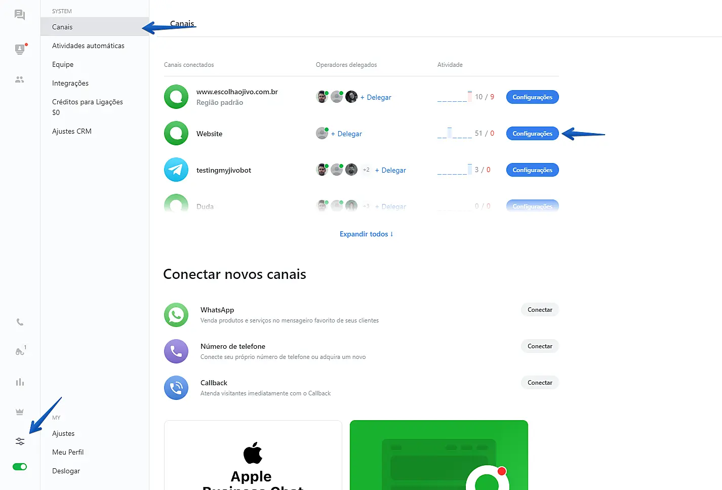 Para inserir uma URL para o recebimento de Webhooks, acesse o aplicativo Web do JivoChat ou um de nossos apps para Desktop e vá até Configurações -> Canais -> Configurações (abaixo do nome do canal que deseja ativar a integração).