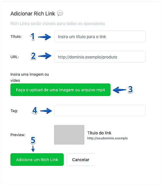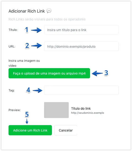 Insira um título (1), URL (2, insira a URL completa incluindo http:// ou https://), selecione uma imagem ou vídeo (3, opcional) de no máximo 10 MB, insira uma tag (4) para que os seus operadores possam identificar o Rich Link facilmente. Ao finalizar, clique em "Adicione um Rich Link" (5).