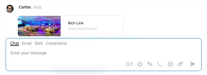 Com a integração do Apple Business Chat, você pode enviar Rich Links durante o chat para direcionar os seus clientes a links específicos do seu site. Assim como as Frases rápidas, os Rich Links adicionados a sua conta podem ser utilizados por todos os seus operadores.