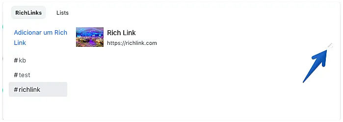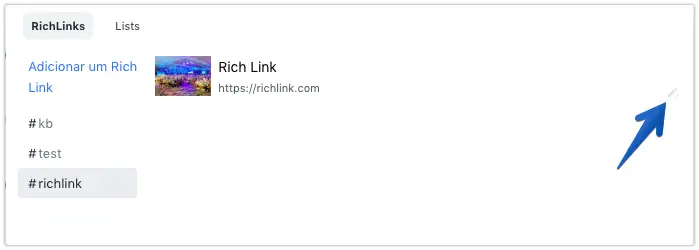 Para editar ou deletar um Rich Link, abra a lista de Rich Links existente e clique no botão de edição localizado do lado direito inferior de cada Rich Link.