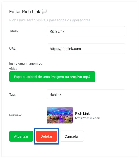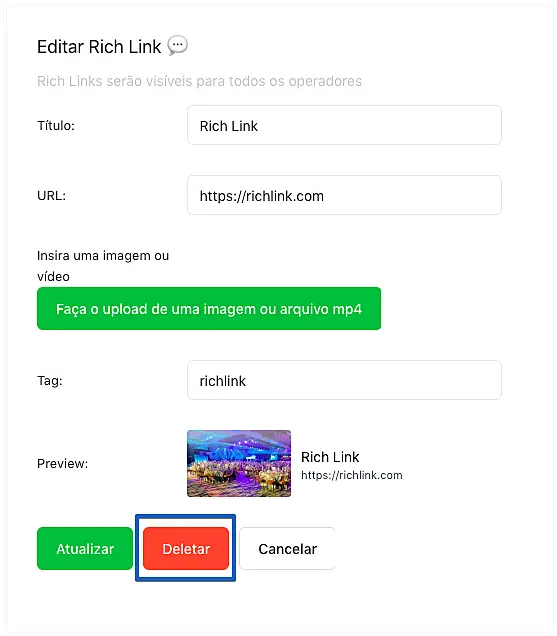 Faça a edição necessária e clique em "Atualizar", ou clique no botão "Deletar" para eliminar o Rich Link.
