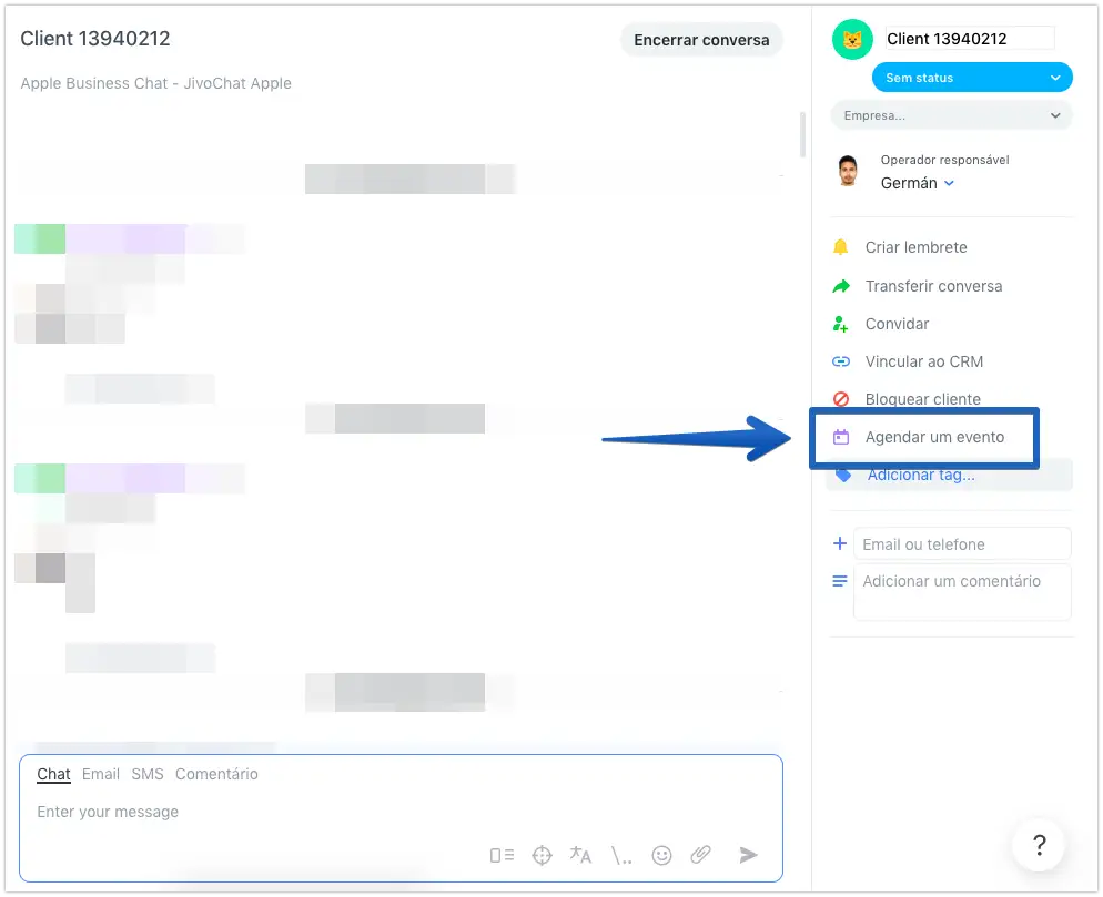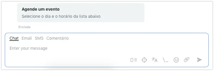 Para criar um calendário customizado e enviá-lo no chat, clique em "Agendar evento" em uma conversa iniciada através do Apple Business Chat.