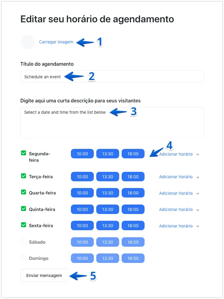 Selecione uma imagem (1; opcional) para o seu evento, um título (2), descrição (3) e selecione as datas e horários (4) que farão parte do calendário. Ao finalizar, click em "Enviar mensagem" (5).