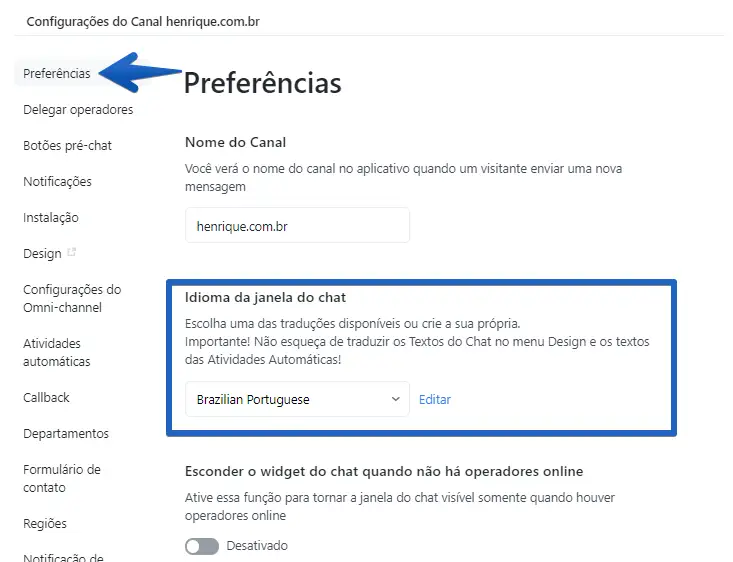 Para alterar o idioma da janela do chat no seu site, abra o Aplicativo Web da JivoChat ou qualquer um de nossos aplicativos de agente de desktop e vá para Configurações-> Canais -> Configurações (próximo ao canal de seu site).