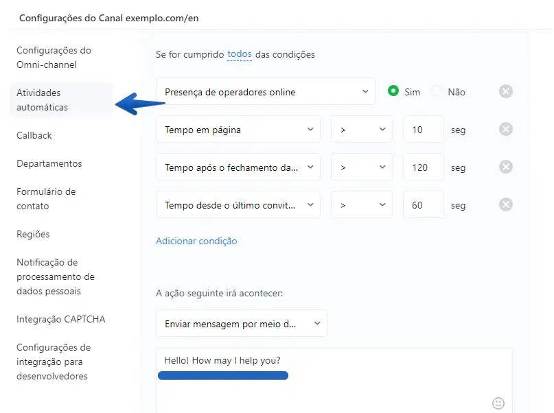 - No menu Atividades Automáticas, modifique o idioma do texto de cada Atividade Automática. Clique em "Editar" ao lado de cada Atividade Automática para realizar este procedimento. Não esqueça de "Salvar" a atividade automática após finalizar quaisquer modificações.