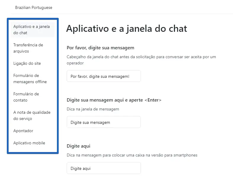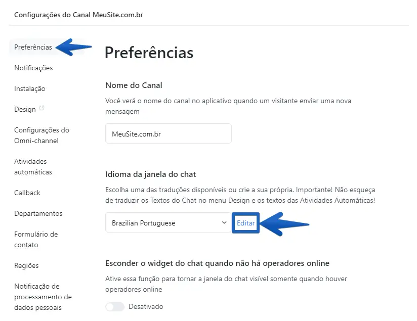 Dentro da opção "Editar", você irá encontra uma lista de menus e diversos campos de textos padrões usados pelo widget do chat no seu site. Fique à vontade para customizá-los como preferir. Não é necessário salvar nenhuma mudança, após editar e clicar fora do campo de edição do texto, ele já é salvo automaticamente.