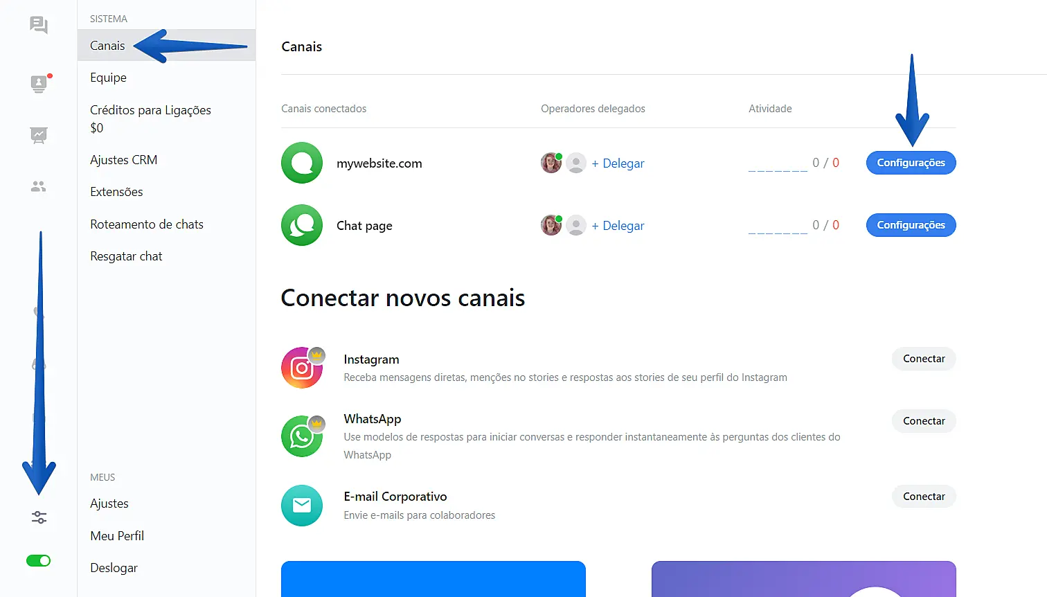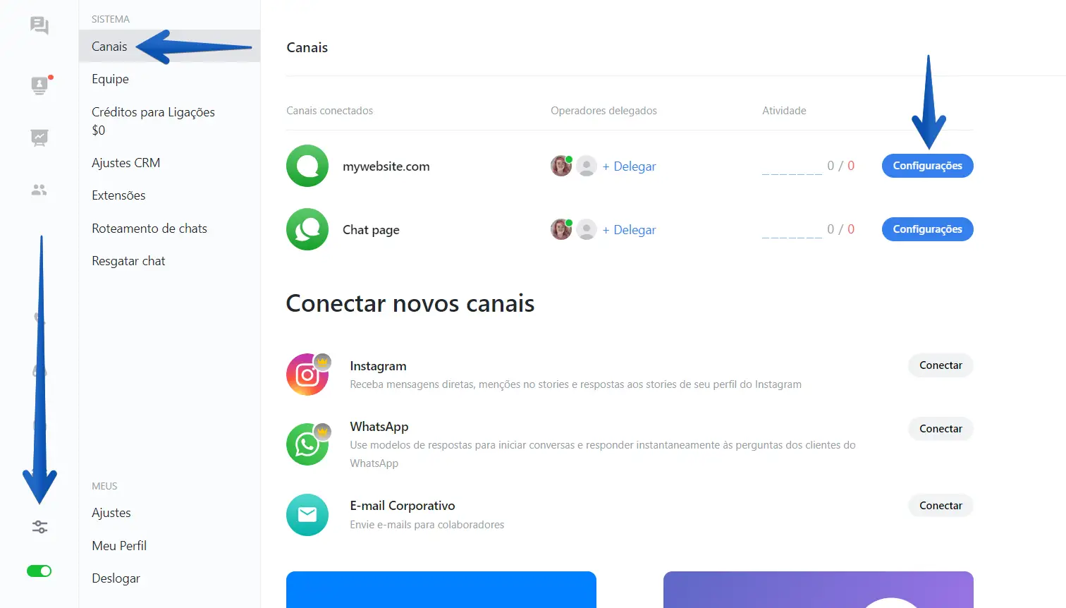 1. Acesse seu aplicativo web do JivoChat ou um de nossos apps Desktop e clique em Configurações -> Canais -> Configurações do canal que você vai ativar o consentimento de uso de dados pessoais (ao lado do canal do seu site).