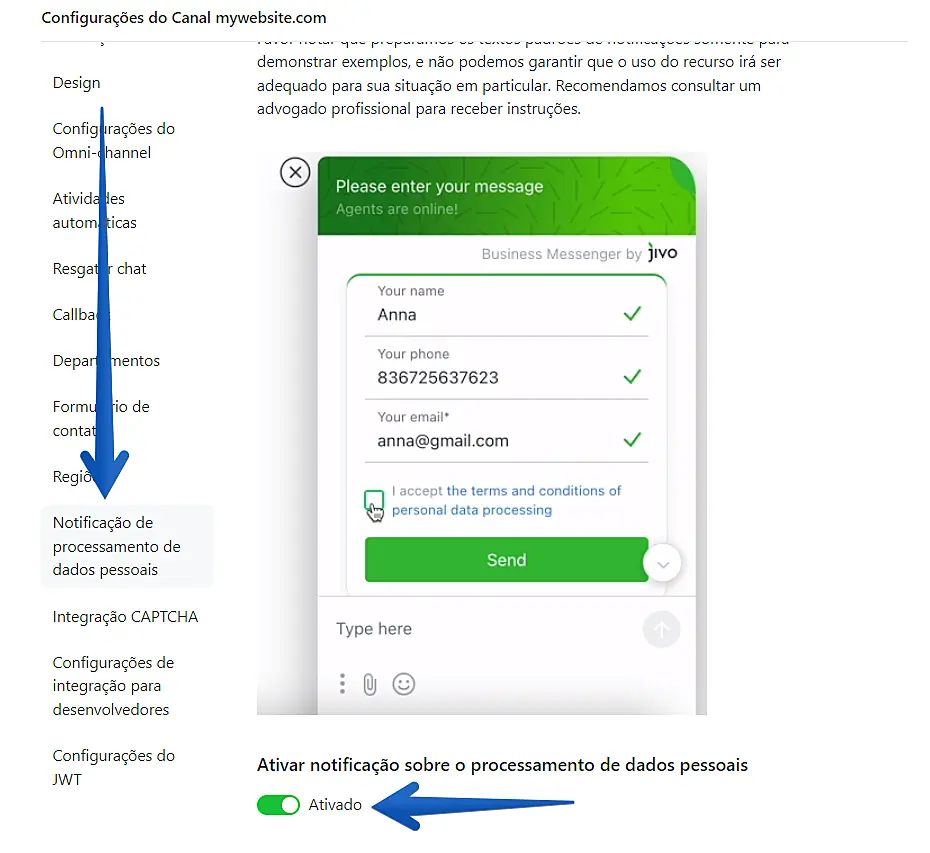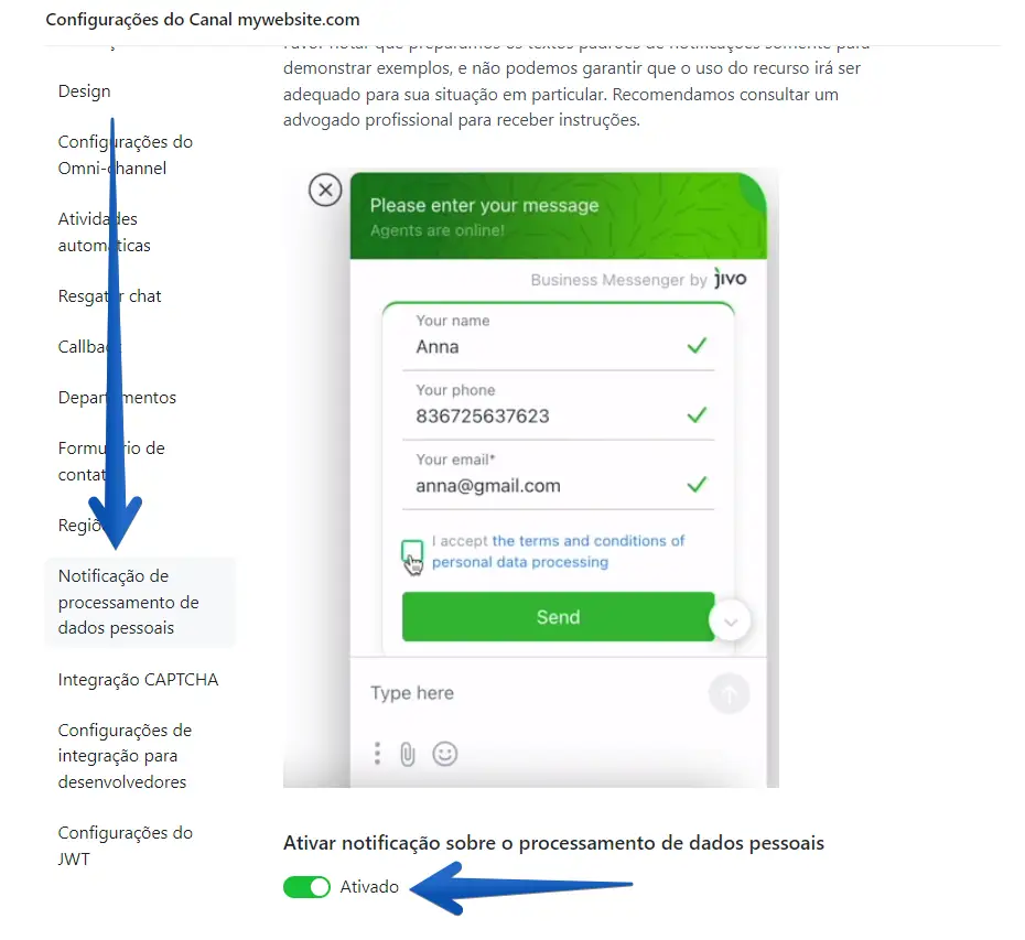 2. Clique no menu Notificação de processamento de dados pessoais e ative o recurso.