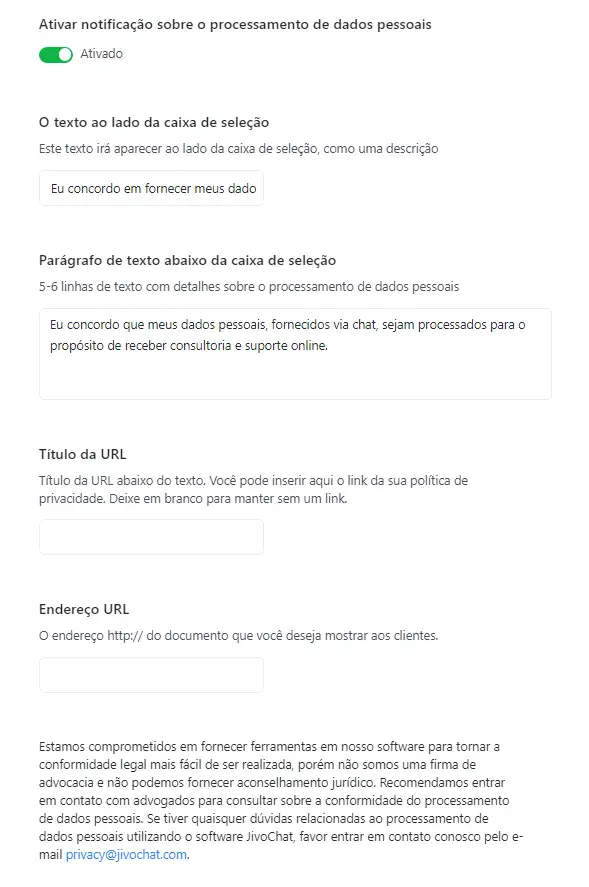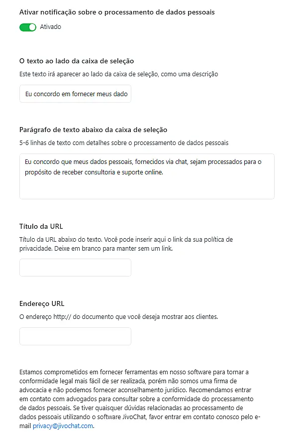 Nossa prioridade é tornar o JivoChat complacente com a LGDP para todos os clientes que utilizam nosso serviço. Preparamos uma rápida instrução que lhe auxiliará a deixar seu chat complacente com a LGDP.