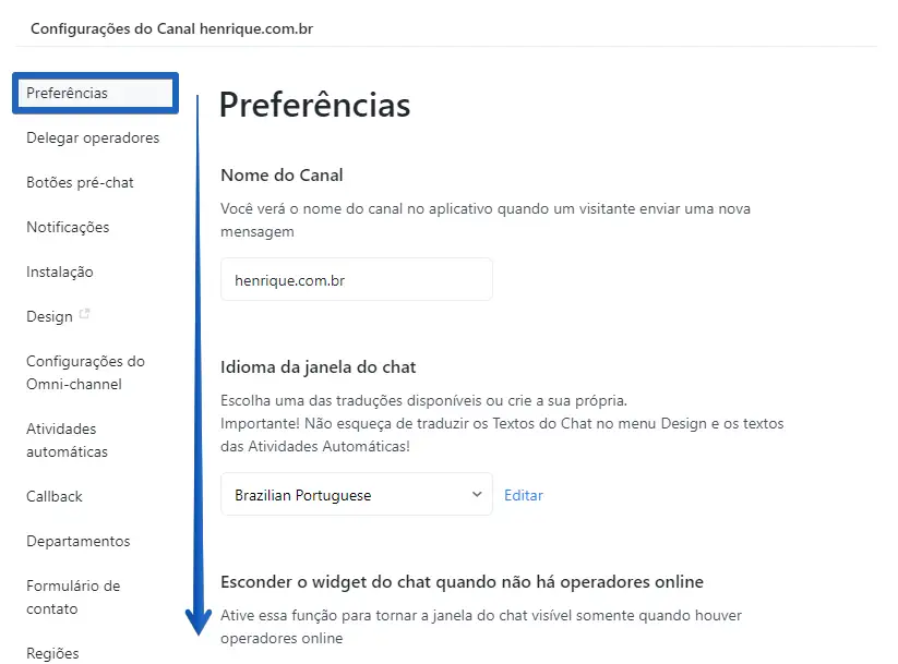 Para ativar a Avaliação da Qualidade do Serviço do chat, abra seu aplicativo web do JivoChat ou qualquer um de nossos apps para Desktop e clique em Configurações -> Canais -> Configurações (ao lado do nome do canal do seu site):