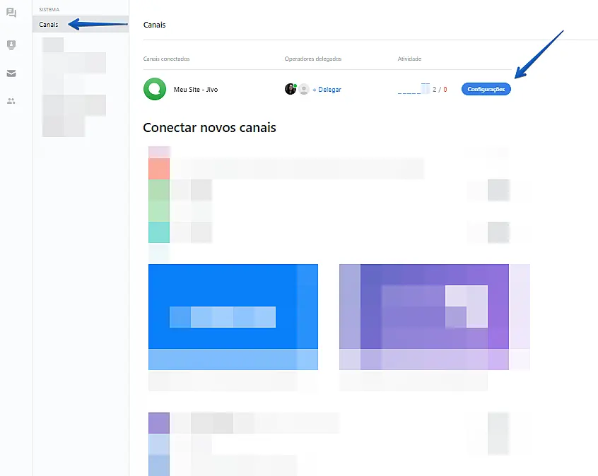 - Faça o login em sua conta JivoChat -> Clique em Configurações -> Canais -> Configurações do canal