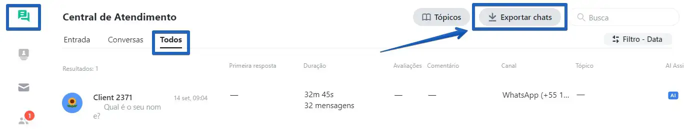 Vá até a aba "Todos" da seção Central de Atendimento e, se necessário, filtre os chats que deseja exportar