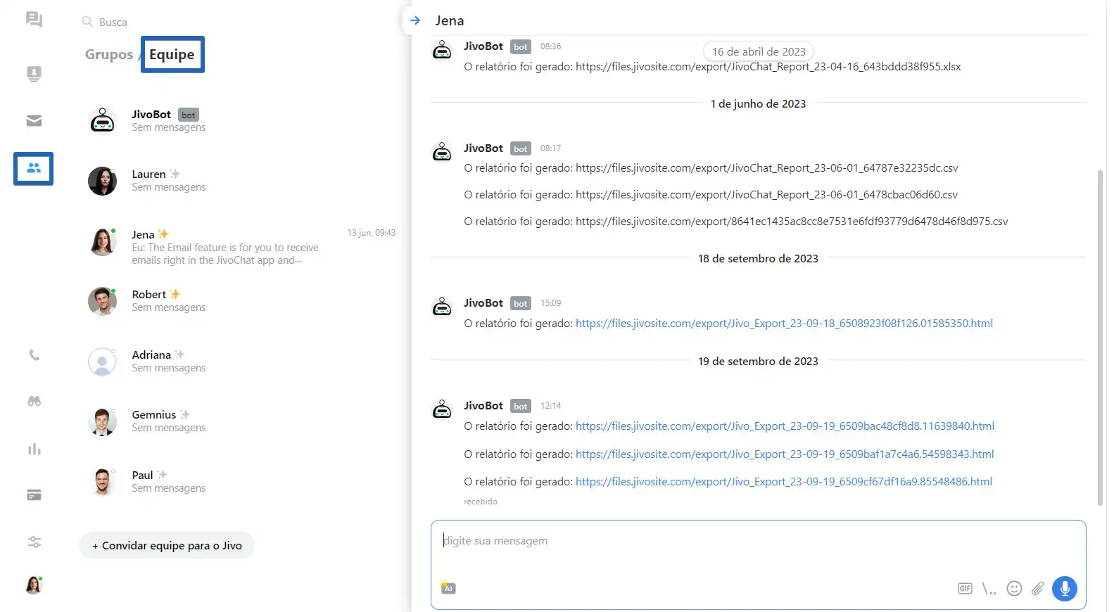 A formação do arquivo pode levar um tempo, o arquivo ficará disponível na seção "Equipe" do chat com JivoBot (basta aguardar notificação)