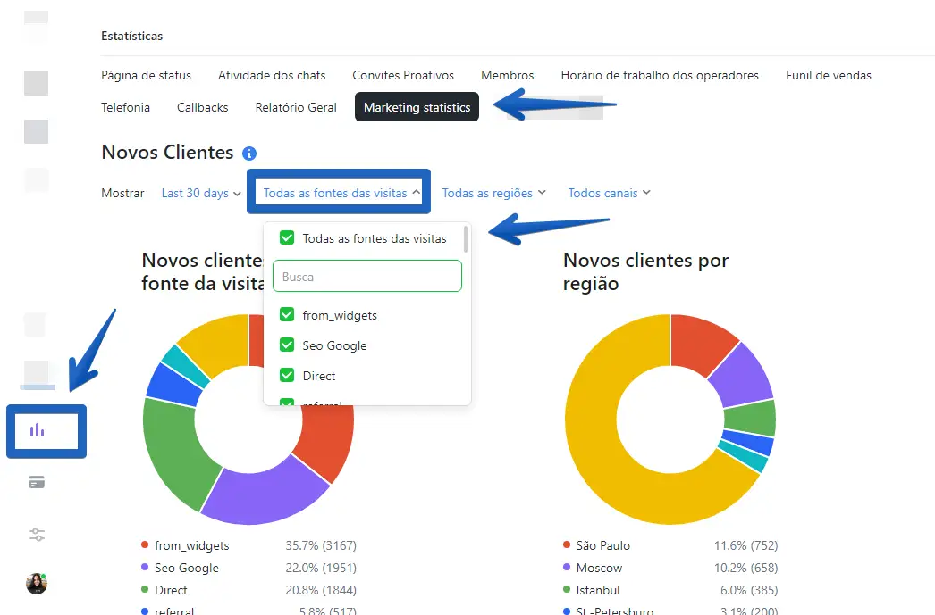 Na aba "Estatísticas" -> "Estatísticas de marketing", você pode começar filtrando pela "fonte da visita"